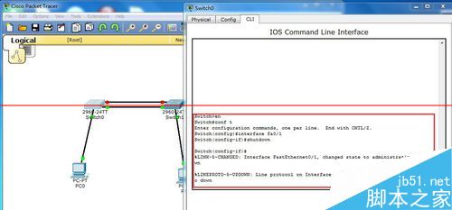 6、pc0 ping pc1可以ping通----將端口fa0/1shutdown后,會發現主鏈路斷開,冗余鏈路馬上接通----此時pc0 ping pc1依然可以ping通,此時RSTP協議即配置完成。