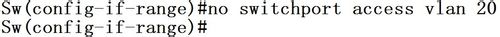 5、然后將這三個接口一起添加到VLAN 20中去,在接口模式下,輸入“no switchport access vlan 20“,如圖所示: