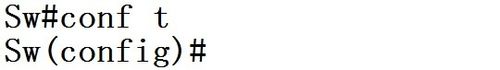 3、在特權模式下輸入”conf t“,進入全局模式”Sw(config)#“,如圖所示: