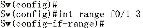 4、接下來在全局模式下進入接口模式,輸入”int range f0/1-3“,這里注意了使用range參數才可以進入多接口,這里選擇f0/1、f0/2、f0/3,三個接口。如圖所示: