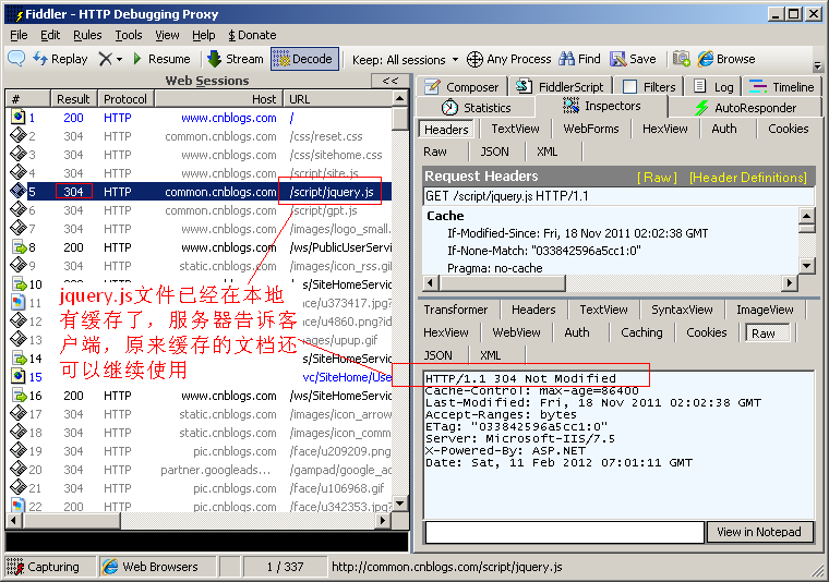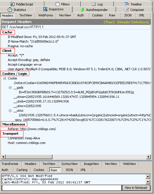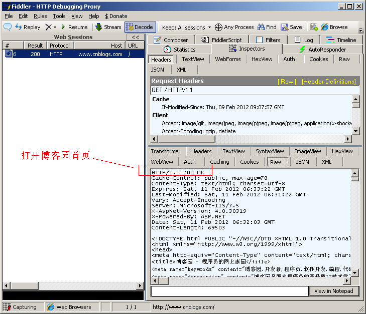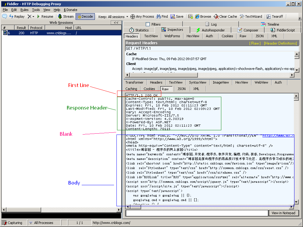 我們用Fiddler 捕捉一個博客園首頁的Response然后分析下它的結構, 在Inspectors tab下以Raw的方式可以看到完整的Response的消息, 如下圖