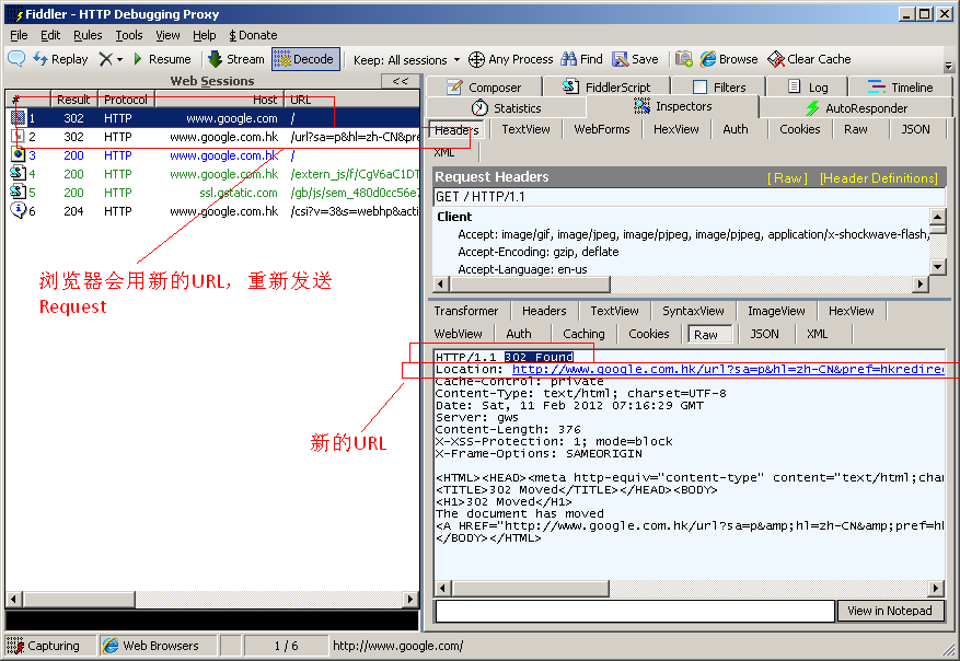 例如在IE中輸入http://www.google.com. HTTP服務器會返回304, IE取到Response中Location header的新URL, 又重新發送了一個Request.
