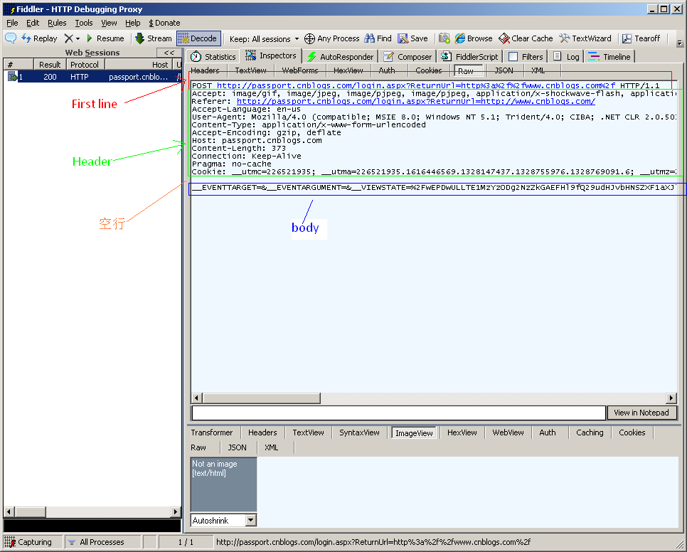 我們用Fiddler 捕捉一個博客園登錄的Request 然后分析下它的結構, 在Inspectors tab下以Raw的方式可以看到完整的Request的消息, 如下圖
