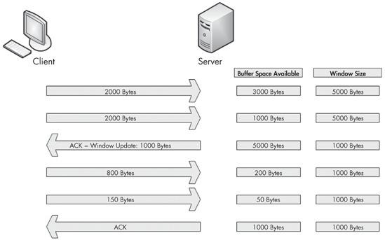 服務(wù)器初始接收數(shù)據(jù)窗口為5000字節(jié)大小。從客戶(hù)端接收4000字節(jié)數(shù)據(jù)之后,服務(wù)器負(fù)載變得非常繁重,無(wú)法繼續(xù)處理客戶(hù)端任何數(shù)據(jù)。服務(wù)器于是發(fā)送窗口大小值為0的報(bào)文。客戶(hù)端暫停數(shù)據(jù)傳輸并發(fā)送一個(gè)探測(cè)報(bào)文。探測(cè)報(bào)文之后,服務(wù)器回復(fù)以告知客戶(hù)端現(xiàn)在可以接收數(shù)據(jù)的報(bào)文,以及窗口大小為1000字節(jié)。客戶(hù)端恢復(fù)傳送數(shù)據(jù)。