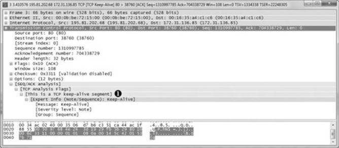 這與上一個(gè)例子中的零窗口報(bào)文十分類(lèi)似,但結(jié)果顯著不同,172.31.136.85主機(jī)不是發(fā)送一個(gè)窗口更新并回復(fù)通訊,而是一個(gè)探測(cè)報(bào)文,如下圖所示:
