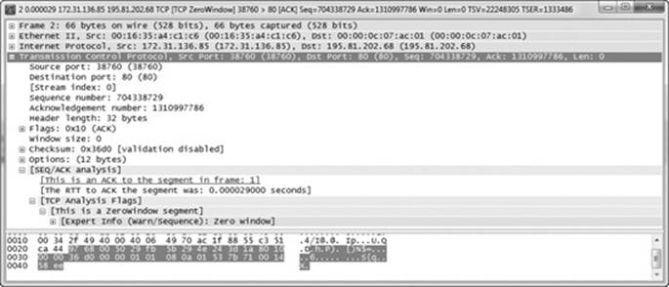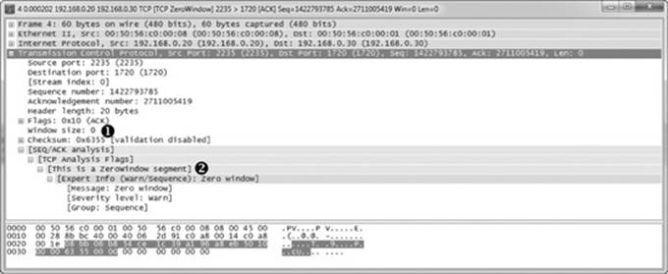 第四個(gè)報(bào)文從192.168.0.20發(fā)送至192.168.0.30,目的是告訴192.168.0.30它不再接收任何數(shù)據(jù)。0值見(jiàn)于TCP報(bào)文頭①,Wireshark的Packet List面板Info欄,以及TCP報(bào)文頭的SEQ/ACK Analysis字段②也告訴我們這是一個(gè)0窗口報(bào)文。