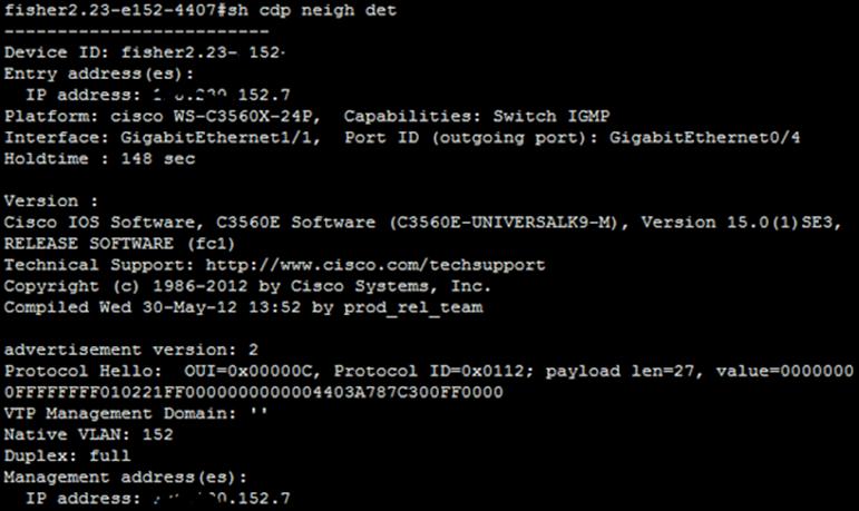 首先,我要講一個背景故事:我曾經在一個團隊中,我們管理的環境中大部分是思科設備。“大部分”這個詞對于設備發現而言有重要意義。與其他網絡供應商一樣,思科提供了一種私有協議,允許網絡管理員查看有哪些設備直接連接了某一臺設備,當然你要有這臺設備的管理員訪問權限。很多讀者肯定都熟悉下面這個思科發現協議(CDP)的截圖: