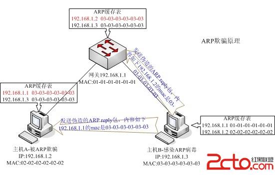 由于在局域網中是使用MAC地址進行傳輸的,因此P2P終結者就偽造這樣的一個ARP應答,把P2P終結者所在的機器A的MAC地址告訴目標機B(目標機B在任意時候都可以接收ARP請求的應答),讓目標機以為本機才是網關,這樣B接收后就會更新本地緩存,以后所有本該走到網關去的包都會從機器A走,這就是一個簡單的ARP欺騙的原理。