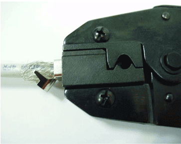 第十三步、放入手工具前端,壓制金屬片(保證你的網線鉗支持七類網線才行)