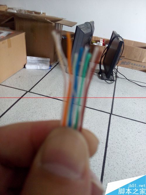 5、將雙絞線按照568B接法,緊密排列在一起,并且要求末端到中端很直,頂端因為后面要剪掉,稍彎點無防。568B接法是:白橙、橙、白綠、藍、白藍、綠、白棕、棕。