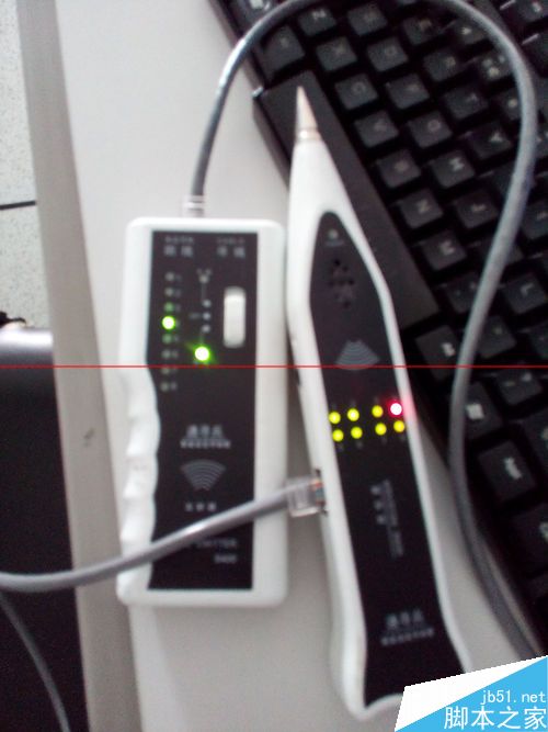 9、另一端也按照上面八步做好水晶頭,然后我們用測線儀來測試一下吧,OK,請看下圖,8根燈全亮,也無錯序。