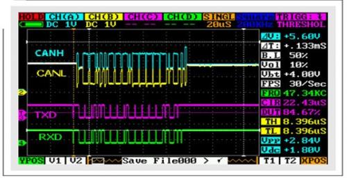 對總線進行調(diào)試時,最為有用的工具之一便是示波器。盡管單通道示波器便可看到信號,但最好還是用雙或者四通道。理想情況下,可同時看到TXD、RXD、CANH和CANL,以確保收發(fā)器和總線性能如預(yù)期。進行初次調(diào)試時,只需一個低帶寬示波器,因為標(biāo)準(zhǔn)CAN被限定在1Mbps。(在不遠(yuǎn)的將來,在引入擁有靈活數(shù)據(jù)速率的CAN以后,這種情況將有所改變。)如果該節(jié)點正發(fā)送數(shù)據(jù)比特流,則可在TXD輸入端看到輸入數(shù)據(jù)。差分CAN總線引腳(CANH/CANL)存在傳輸延遲,同時還存在RXD輸出傳輸延遲。在CAN中,這些延遲均為循環(huán)時間,或者說循環(huán)延遲。如果該節(jié)點正在接收,則TXD閑置;但是總線和RXD輸出會顯示CAN幀。