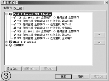 TCP協(xié)議的110號端口用于接收郵件、25號端口用于發(fā)送郵件,UDP協(xié)議的53號端口用于DNS域名解析,對于上述三個端口始終打開。經(jīng)過上述配置后除192.168.1.188(治理者或多媒體機房教師機的IP地址)可以在任意時間對因特網(wǎng)進行訪問外,其他用戶上班時間只能收發(fā)E-mail,下班時間才可以對因特網(wǎng)進行任意訪問。WinRoute中數(shù)據(jù)包的過濾規(guī)則是由上至下,有一條符合條件將不再繼續(xù)往下比較,如無一條件滿足,默認(rèn)的是答應(yīng)通過。根據(jù)以上規(guī)則,用戶還可以根據(jù)各單位具體需要制定出更符合自身需求的過濾規(guī)則。