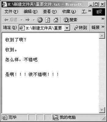 你先在這個文本文件中輸入一個話,按快捷鍵Ctrl+S來進行保存輸入的內容,然后再點擊IE瀏覽器中的“刷新”按鈕來進行刷新,怎么樣,你剛才輸進去的話就已經顯示在瀏覽器中了,如果對方此時也按了“刷新”按鈕,那就可以看見你剛才輸入的那段話,那么,對方也按照前面的方法點擊菜單“查看→源文件”來打開這個文本文件,按照上面同樣的方法輸入并且保存輸入的話,然后就可以在IE瀏覽器中按“刷新”按鈕來顯示輸入的話了,如果你也按“刷新”按鈕的話就可以看見對方輸入的內容了(圖2)。