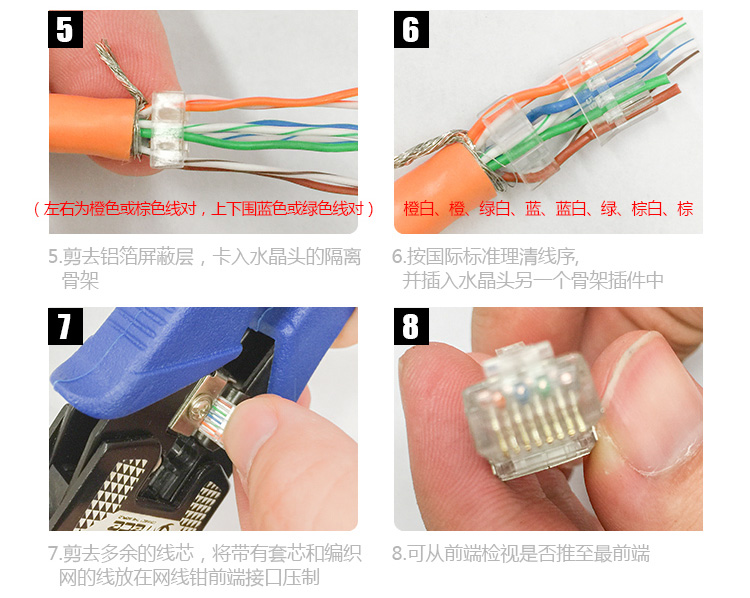 3、 穿好穿線件后減去多余線纜時要與穿線件的一端平齊,插入水晶頭外殼后要一直插到外殼的最前端,否則會導致接觸不可靠。