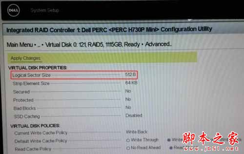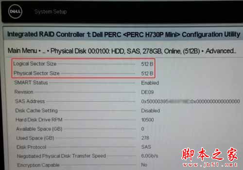 如上圖,這臺(tái)戴爾服務(wù)器配置了PERC 9系列RAID卡中的H730P Mini,它識(shí)別到當(dāng)前選定SAS硬盤(pán)的物理和邏輯扇區(qū)大小都是512Byte。