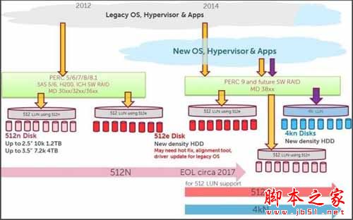 如上圖,左邊是比較早的戴爾服務(wù)器SAS RAID卡、HBA、主板集成軟RAID和MD家族陣列控制器。它們能夠支持512e仿真扇區(qū)的硬盤(pán),對(duì)于較早的操作系統(tǒng)可能需要補(bǔ)丁、對(duì)齊工具(比如讓NTFS文件系統(tǒng)的簇與物理扇區(qū)對(duì)齊)和驅(qū)動(dòng)更新。
