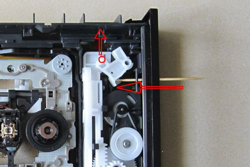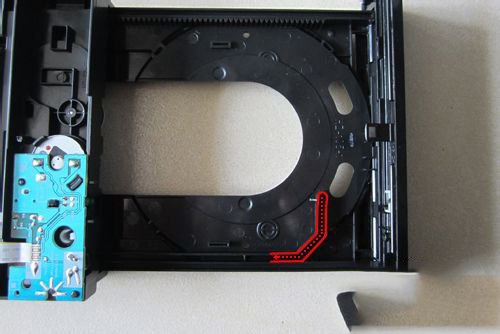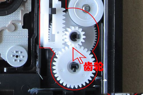 5、在內部結構中,我們會看到,托盤的彈出需要用齒輪和皮帶的帶動。大部分光驅不出倉是因為這兩處出現問題。