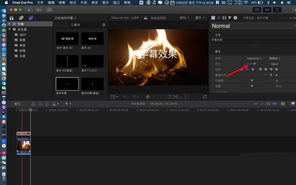 4、點(diǎn)擊字幕條,輸入字幕,基本大小處,調(diào)整字幕大小。