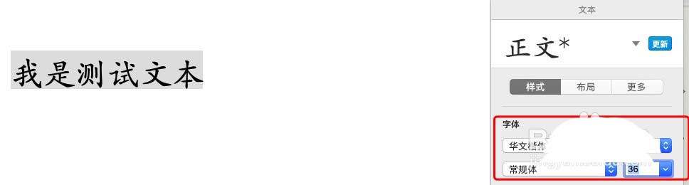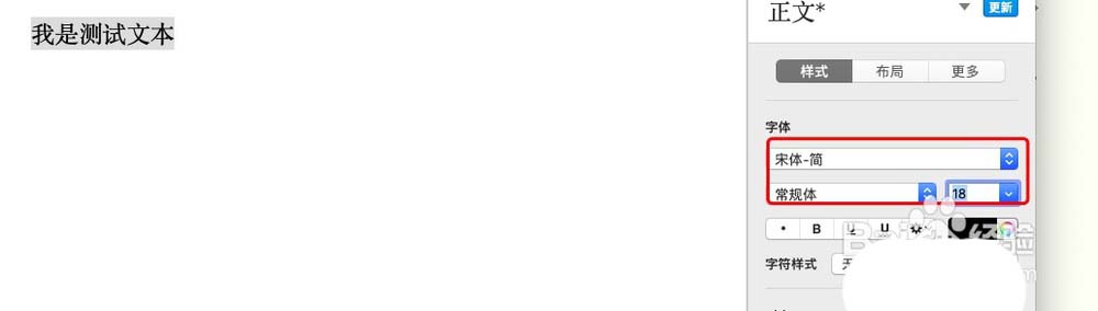 3、輸入第一段測試文本,并設定樣式,例如宋體,18號。