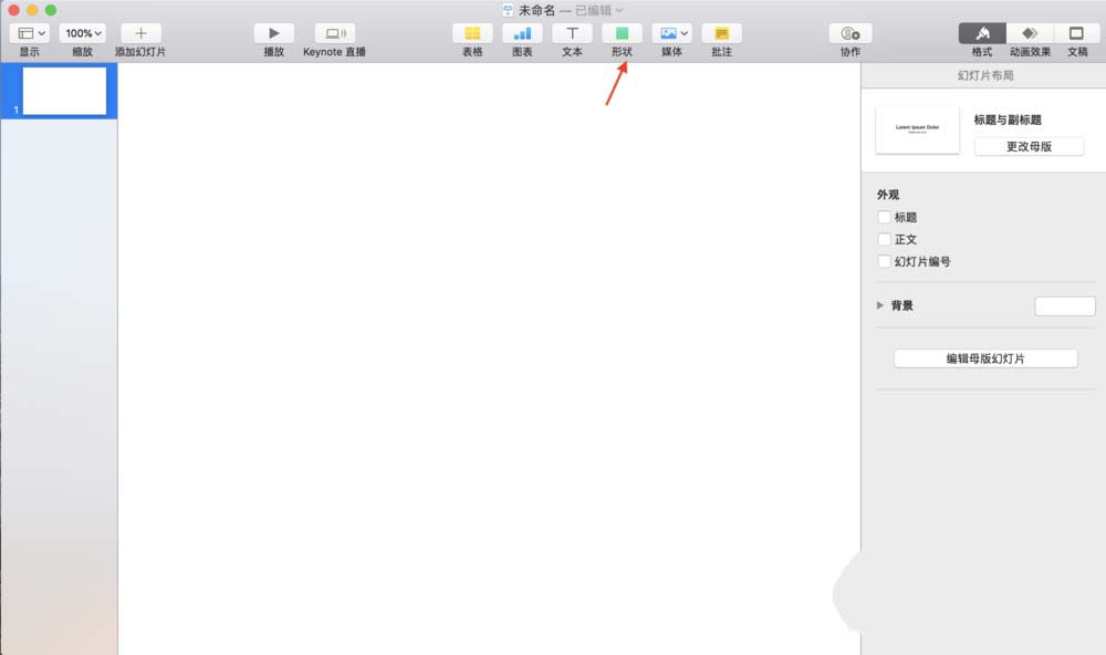 1、打開keynote軟件,創建一張空白的幻燈片,然后點擊工具欄上的“形狀”
