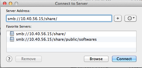 在Mac中, 先打開Finder, command +K 打開共享目錄 輸入: smb://192.168.0.4/share
