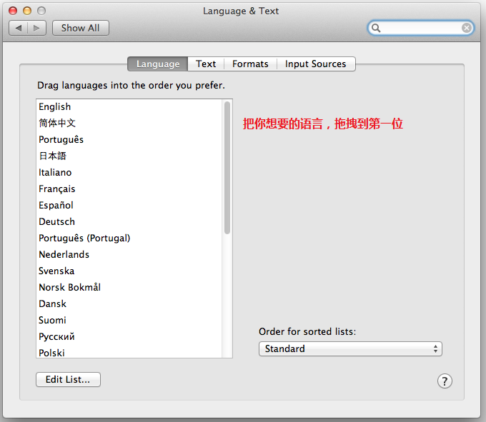 打開System Preferences ->Person下的Language&Text->Launage下。 把你想要的語言拖拽到第一位