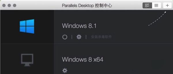 1、在 Mac 上打開 Parallels Desktop 的控制中心,點擊右上角的 + 按鈕,創建一個新的虛擬機。