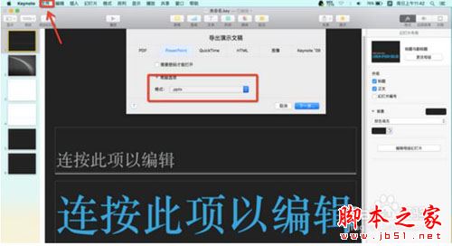 編輯完成后,Keynote的默認保存格式為.key,并非是我們常用的.ppt或者.pptx的格式,可以通過文件-》導(dǎo)出-》powerpoint,來進行相應(yīng)的操作修改,這樣我們精心制作的ppt就可以在微軟系統(tǒng)下馳騁了