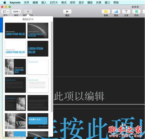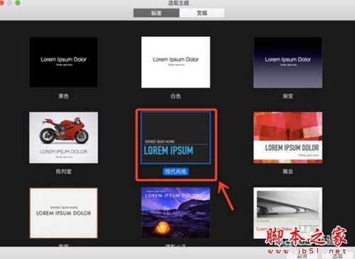 在接下來的界面中,頂部可以選擇寬幅還是標準,底部選擇樣式,可以看到,Keynote和powerpoint比起來還是樣式很豐富的