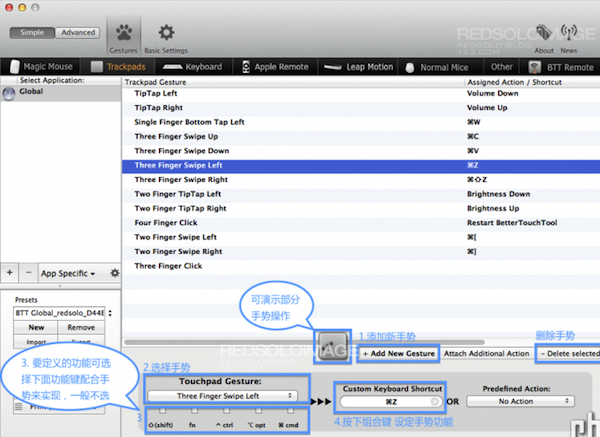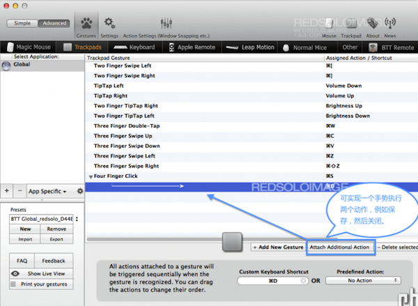 尋覓了很久適合imac的多功能無線鼠標,一無所獲。不經意間看到介紹BetterTouchTool的文章,如獲至寶。os x對觸控板的設置并沒有完全發揮出它的潛力,右手能干的事情還可以更多。BetterTouchTool(簡稱BTT)就是這樣一款軟件,把觸控板的潛力發揮到淋漓盡致。平時使用方面(非游戲),功能上秒殺G700s,即便是20多個功能鍵的G600也望塵莫及。