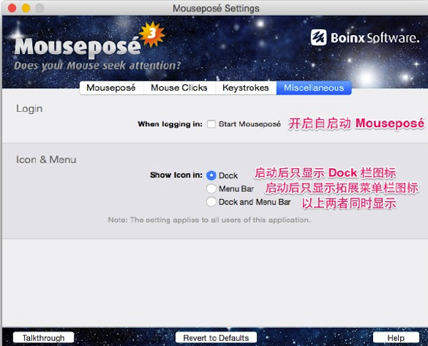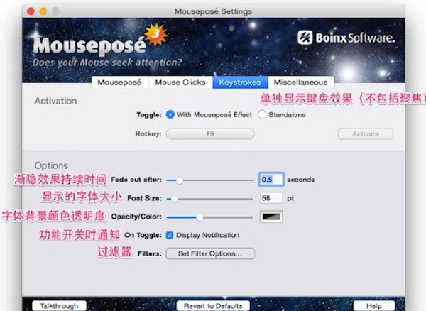以上兩張截圖是對 Mouseposé 常規(guī)設(shè)置標(biāo)簽頁的翻譯,用戶可以在此設(shè)定合適的啟動快捷鍵和時間,所以這部分的設(shè)置項目是最多的,萬一在設(shè)置過程中迷失了方向,以致于快捷鍵紊亂,請點擊正下方的「Revert to Defaults」還原至初始狀態(tài)。一切設(shè)置完畢后,可以點擊「Activate」體驗效果,便于再次修改。
