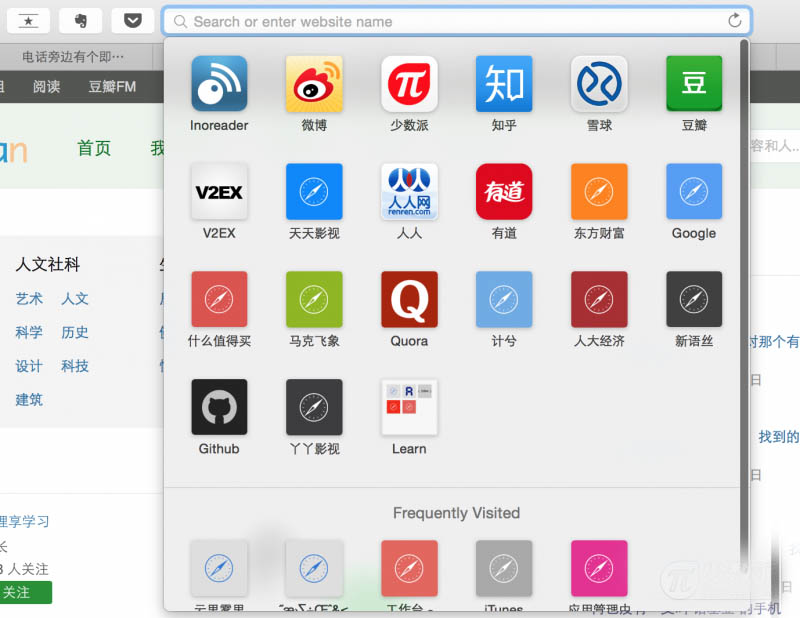 你只需要點擊地址欄,會自動下拉打開收藏夾里的所有網頁,網站的 favicon 會作為大圖標顯示排列,你可以直接點擊在當前頁打開,或按住 Command 點擊,則會在新標簽頁中打開。