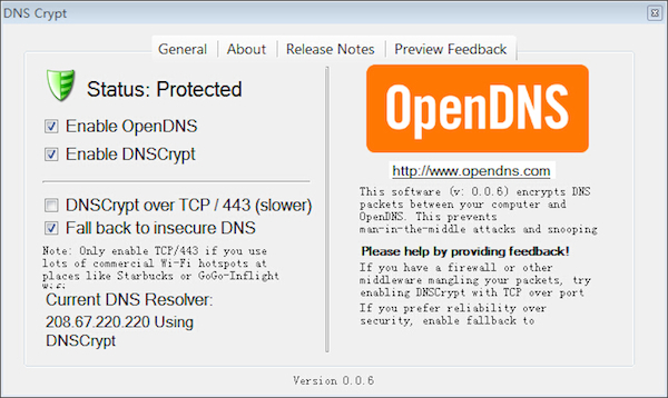有一款軟件可以解決這個(gè)問(wèn)題。OpenDNS發(fā)布的軟件DNSCrypt,可以加密DNS請(qǐng)求和返回,保證DNS返回值不被篡改和污染,讓我們得到正確的DNS查詢返回值。軟件有Windows版本和Mac OS版本,下載地址如下: