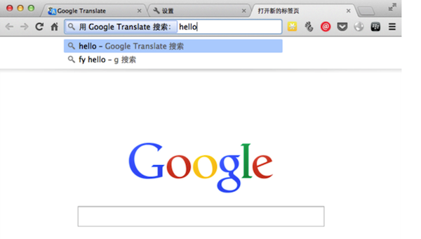 第五步:像我上面設置了 「fy」 ,當我在地址欄輸入 「fy」 然后再按下空格后,omnibox 會出現,之后再輸入你要翻譯的內容。