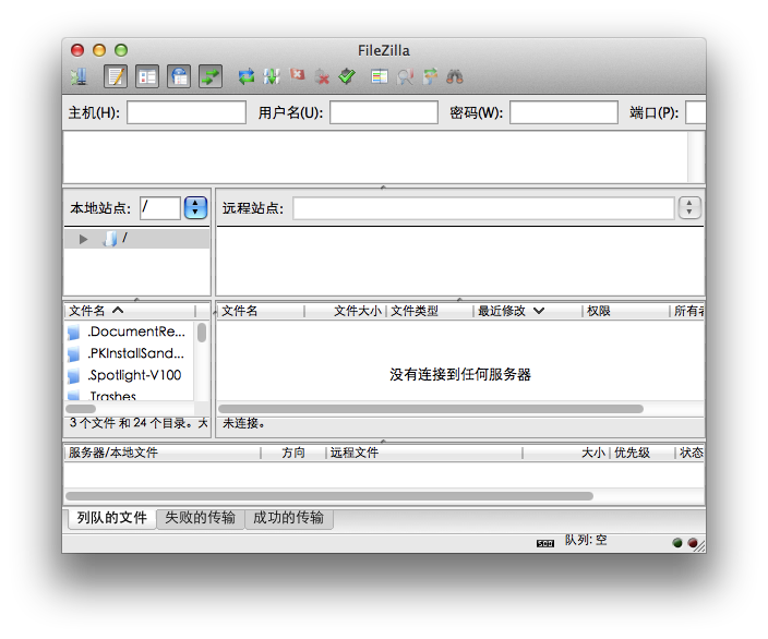 首先,自然是要下載 Filezilla for mac中文破解版,下載安裝之后,首次打開將會使下圖所示的界面。