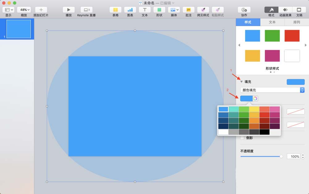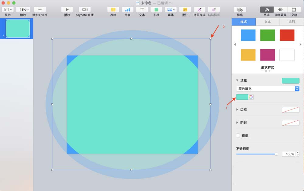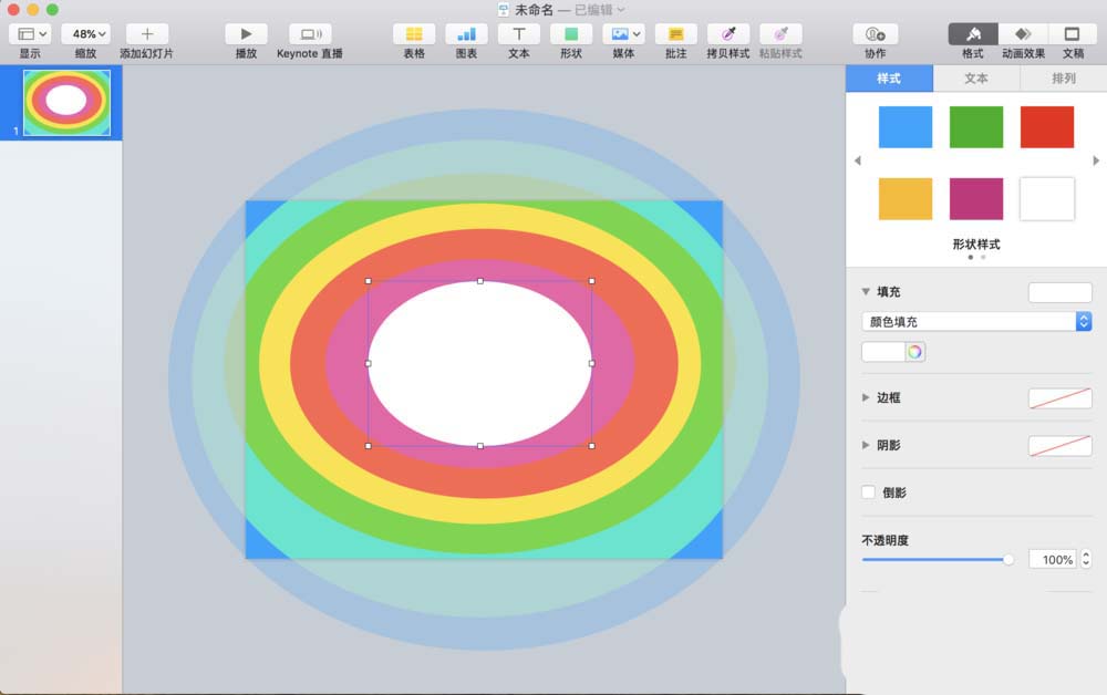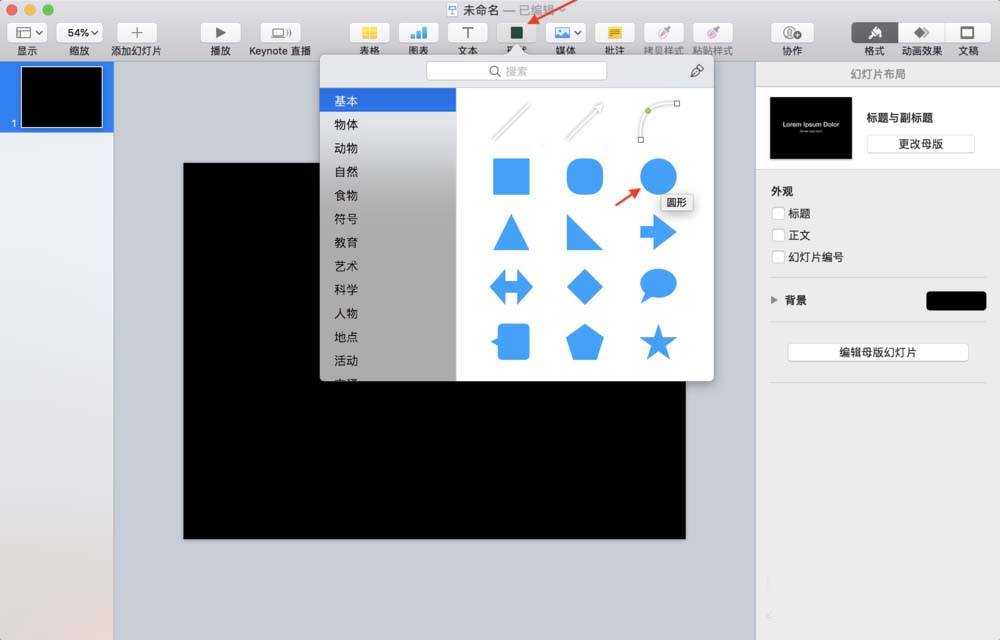 1、首先keynote軟件,新建文稿,工具欄上選擇“形狀”-》基本,選中圓形圖標