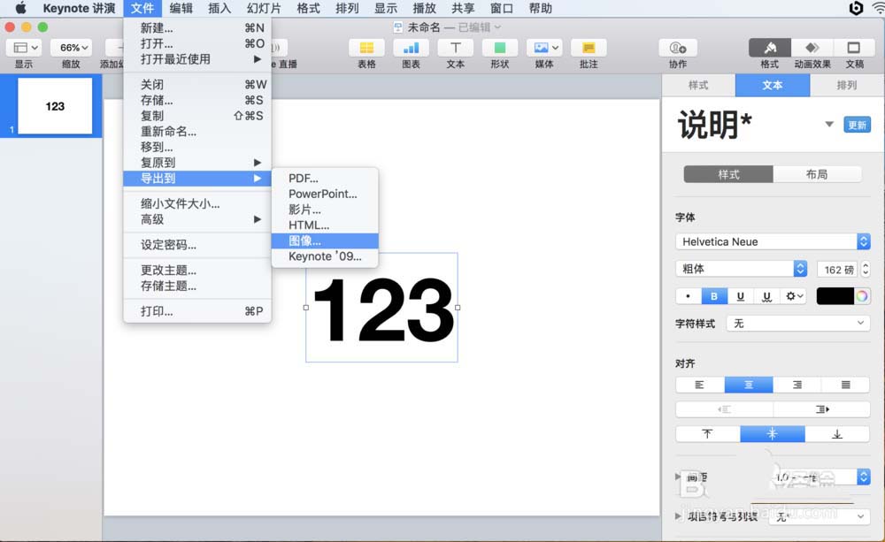 1、打開軟件keynote, 創(chuàng)建一張空白的幻燈片,工具欄選擇文本,然后幻燈片中間輸入文字,接著文本屬性窗口上調(diào)整文字的大小