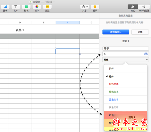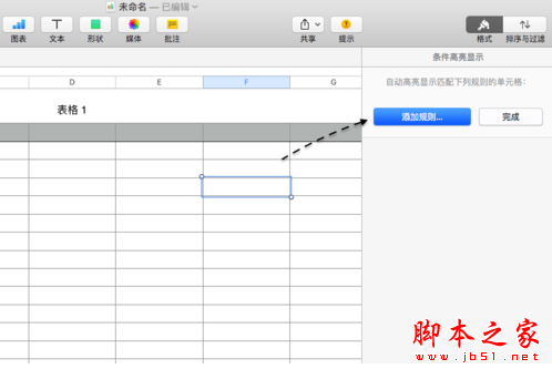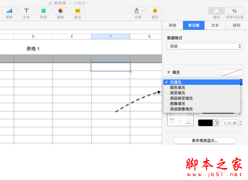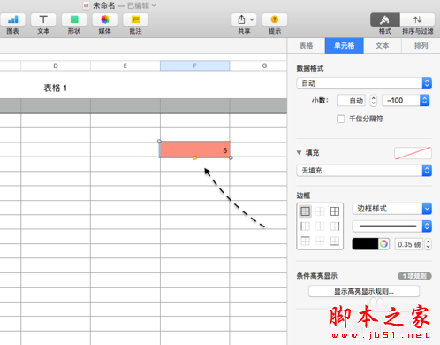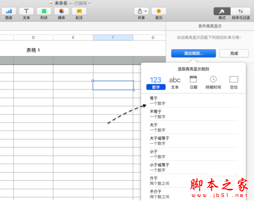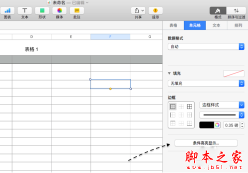 1、有時候在表格中可能會需要用到讓 Numbers 自動根據條件來判斷是否要填充的需要。同樣地,先選中一個單元格,然后在【單元格】欄目下點擊【條件高亮顯示】選項,如圖所示