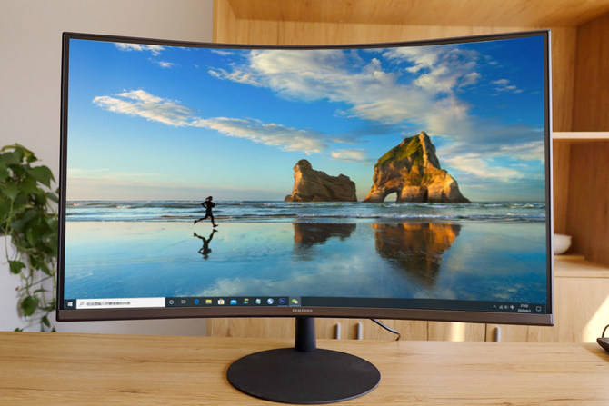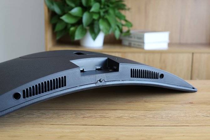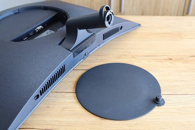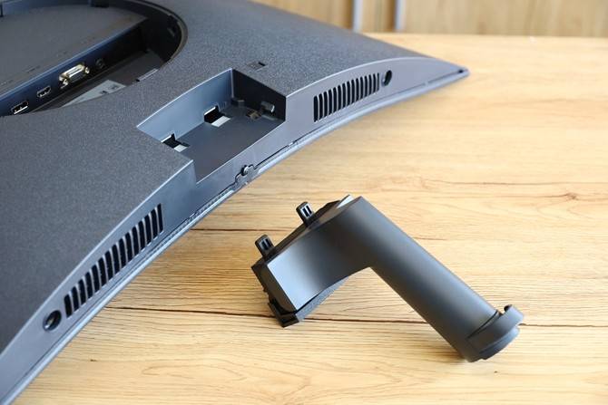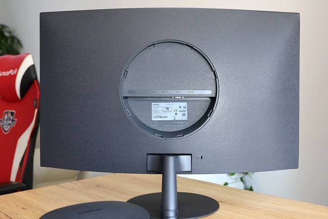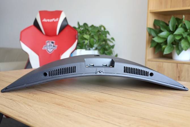 顯示器的背面與三星UR55等顯示器類似,圓形的開槽,內部是接口和銘牌。顯示器不支持壁掛或手臂式支架,這與其曲面屏屬性有關系,一般來說,還是放在桌子上更為穩妥,視覺效果更好。