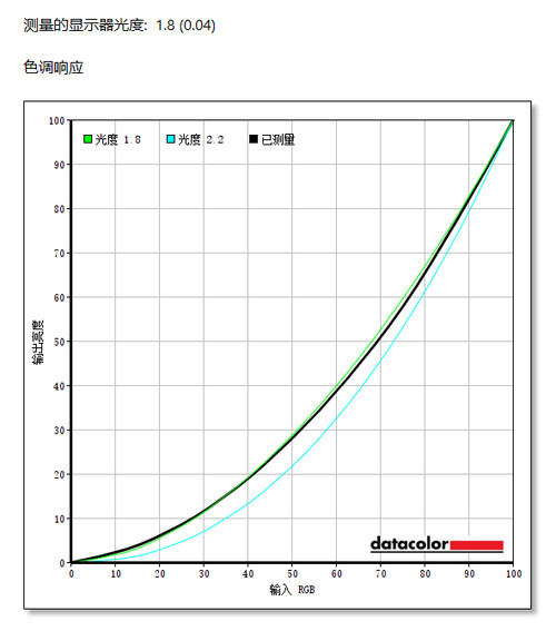 色調響應方面,兩條光度曲線跟已測量相距都很近,過度平滑,已經是相當完美的曲線。理想中的狀態是三條線完全重合,然后將圖像成對角線分割。但是在實際測量中,幾乎沒有顯示器能夠到最完美狀態,所以我們主要看下面的兩條線,重合度越高越好,這樣的曲線已經是難得一見的完美了。