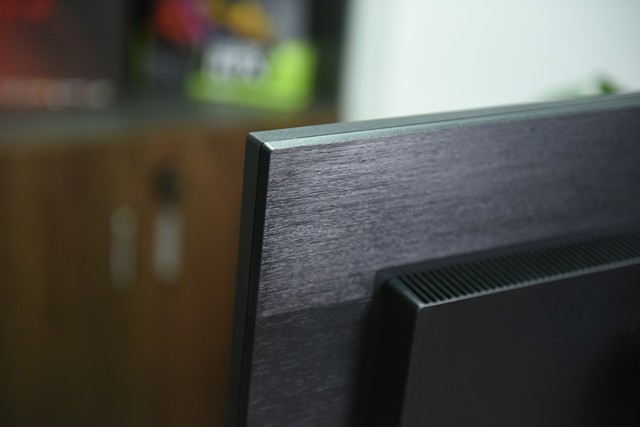 簡約不代表簡單,放在商用人士桌面的生產力工具,沒有質感怎么行?整個底邊框都采用了金屬拉絲的工藝,(當然后背也是采用相同的設計)配合銀色的LOGO,在燈光的映襯下格外有質感。