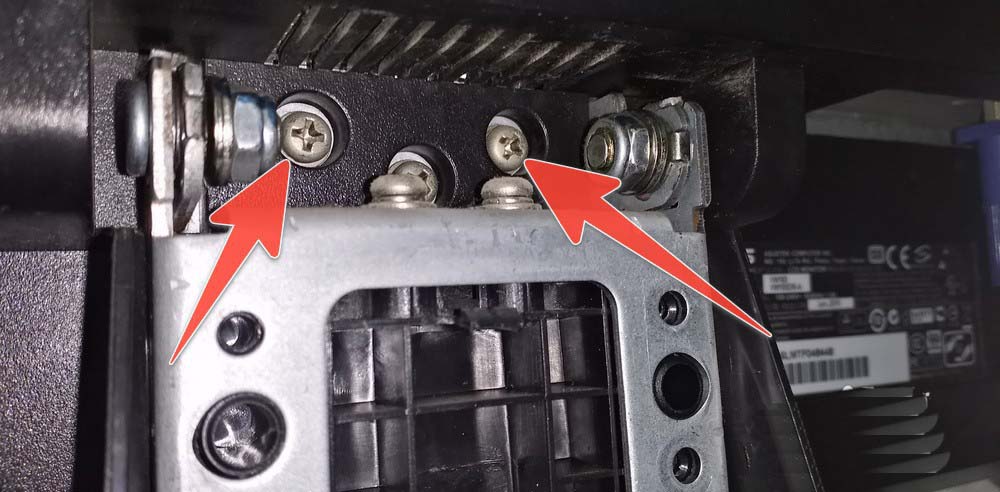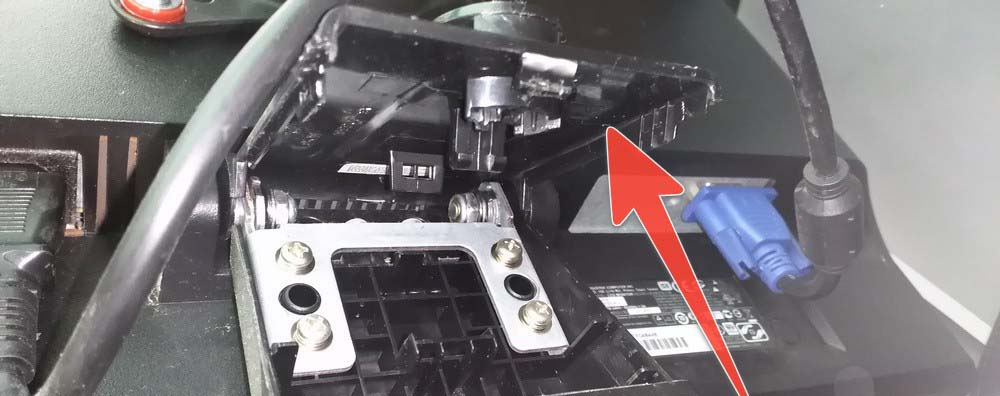 6、揭開蓋板后,就可以很方便的,把支架與顯示器的連接螺絲卸下來;用十字起子把箭頭所指處的,螺絲擰出來。