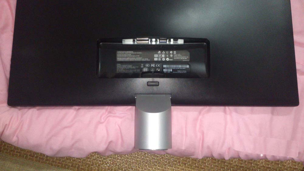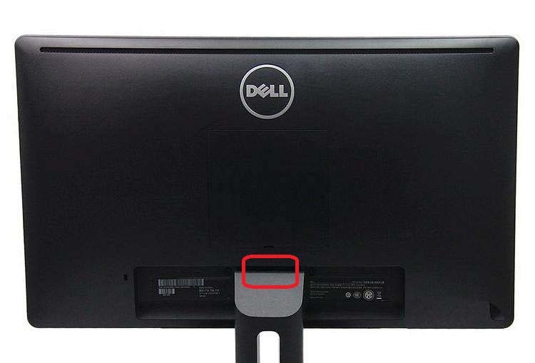 4、類似E2214HV型號的顯示器,要先下壓底座,使得底座與顯示器主題的上連接部分漏出來(如下圖中的紅框所示),然后按住露出的扣具部分,往外輕拽即可卸下底座