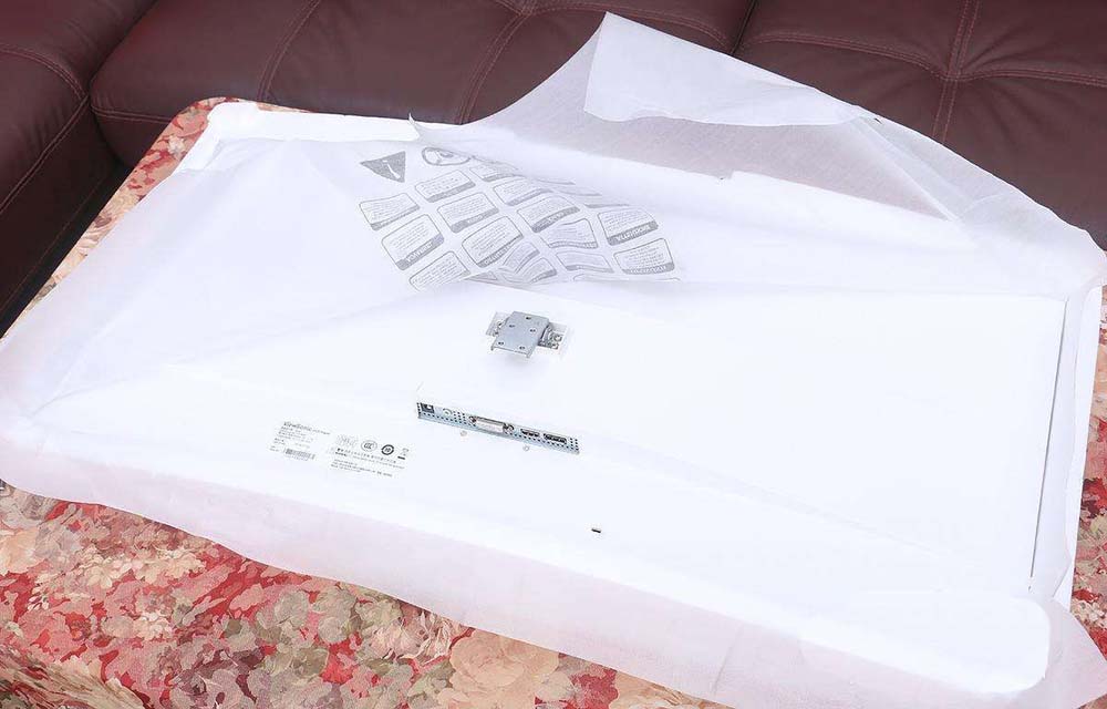 2、將顯示器面板平放到軟墊上,防止劃傷顯示器,顯示器背面朝上,底座朝向操作者一面