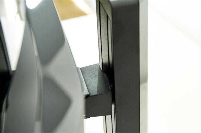 顯示器的高度和俯仰角度就是通過這個底座支架實現的,支架上有兩條滑軌,輕輕上推和下壓就能調節高度,阻尼感正合適
