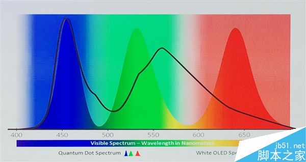 現有的彩電顯示技術依靠紅綠藍三原色的組合來形成色彩,量子點薄膜背光和OLED技術在紅綠藍三色的光譜大概如下圖所示,我們可以看到藍色光譜的Q與O都非常明朗清晰,但是在綠色跟紅色之間,OLED并沒有像量子點那樣純粹。所以,OLED為了得到更純粹的三原色,就會使用較強的過濾層,反過來,這種方法又會使它的能量效率降低,色域和亮度都不能完全施展。