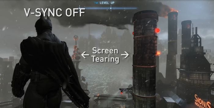 蝙蝠俠benchmark中旋轉場景,沒有開啟任何同步技術就能明顯看到煙囪上下撕裂