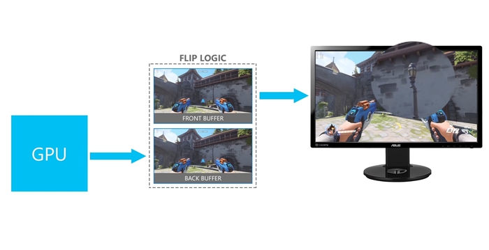 在沒有使用任何的畫面同步技術時,我們常常遇見一些畫面上下撕裂沒有對齊的現象,這是因為顯卡在處理圖像的時候并不是以流水線形式按部就班一步步渲染畫面每一個部分,而是大量的CUDA單元并行處理,繪制好的每一幀圖像會暫留在顯存中,等待GPU通知輸出畫面。但是由于每一幀圖像畫面內容有簡單也有復雜的,導致渲染時間不一樣,但GPU從顯存中輸出畫面的時間卻是固定的,過長的渲染時間會造成第一幀還沒顯示完成,第二幀畫面卻被通知顯示,造成該時間內出現兩個不同時間的半幀,上半部分還是第一幀,下半部分卻是第二幀的問題,從而形成了畫面撕裂,此現象對于一些快速切換帶有類似高樓大廈物體的場景尤為明顯。