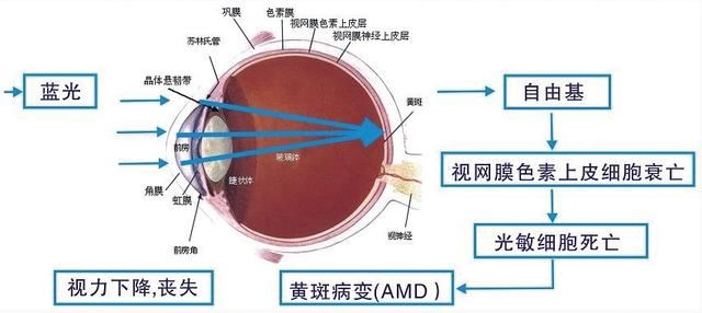 我們這里所說的藍光是指波長在415~455納米之間的高能藍紫光,這樣的光對眼睛的影響很大,尤其是對晶狀體和視網膜。短波藍光具有極高能量,能夠穿透晶狀體直達視網膜,誘發視力損傷甚至增加黃斑區毒素量導致盲眼病。